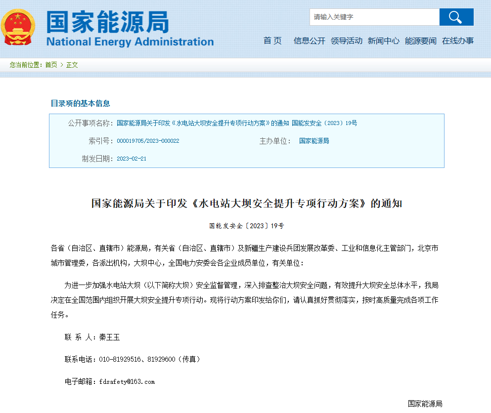 2023年2月28日,国家能源局发布的《水电站大坝安全提升专项行动方案》(国能发安全〔2023〕19号)(以下简称《方案》)的通知指出,为进一步加强水电站大坝安全监督管理,深入排查整治大坝安全问题,有效提升大坝安全总体水平,国家能源局决定在全国范围内组织开展大坝安全提升专项行动。