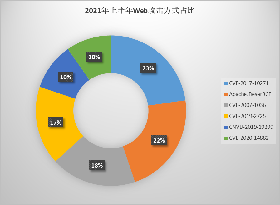 2021年上半年,火绒【Web服务保护】功能拦截漏洞攻击达150万次,根据数据分析,主要为CVE-2017-10271漏洞攻击、Apache.DeserRCE漏洞攻击、CVE-2007-1036漏洞攻击以及CVE-2019-2725漏洞攻击(如下图)。对于有网站的用户来说,如果不注意安全方面的问题,很容易被黑客针对上网行为或网站服务器等设备进行攻击行为。