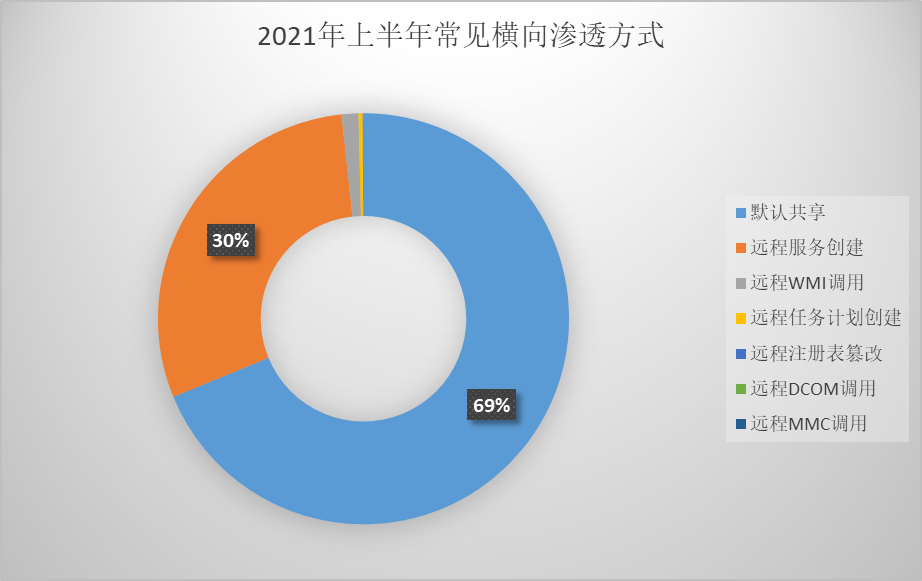 2021年上半年,火绒【横向渗透防护】功能拦截超过三千万次的横向渗透攻击,其中,以黑客利用默认共享和远程服务创建进行横向渗透攻击为主,分别占比69%和30%(如下图)。正因为默认共享、远程服务创建这两种系统自带的功能容易被利用,所以常被黑客、病毒利用在内网进行横向渗透攻击,比如知名的DTStealr、Wannamine等病毒,均是用了此类攻击方式,在企业内进行传播。