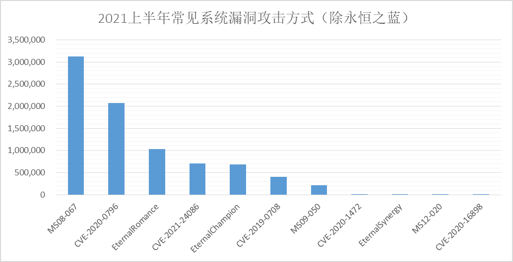 2021年上半年,火绒【网络入侵拦截】功能共帮助用户拦截漏洞攻击达1.5亿次。对拦截量数据进行分析,除依旧在全网大范围出现的“永恒之蓝”漏洞攻击外,常见的还包括MS08-067、CVE-2020-0796,以及永恒浪漫等漏洞攻击。系统老旧,打补丁不及时等都是造成漏洞攻击的重要原因(如下图)。如去年微软已停止支持Windows 7,市场上超过1/5的的用户还在使用该系统。