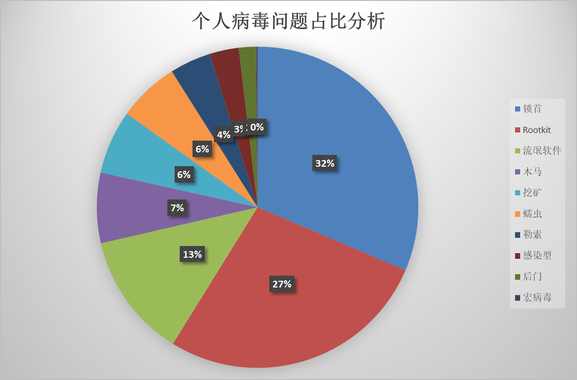 对感染终端量排名前十的病毒数据进行分析,后门病毒感染最多的终端数量,排名第一;木马病毒出现次数最多。同时,金山、巧压等软件更是凭借知名的流氓行径,挤进了感染终端数量前十的病毒家族中(如下图)。
