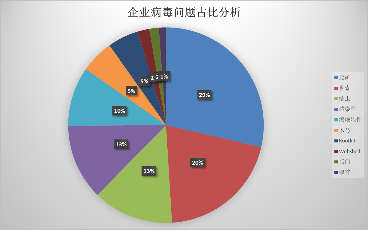 以在企业用户安全事件中,攻击类型排名第一的挖矿病毒(如下图)为例,事实上在2019年和2020年火绒统计的企业问题中,挖矿病毒均占比第一。挖矿病毒通过不断更新传播方式,大量长期存在于用户设备上,挖矿获取利益。