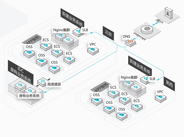 用户业务遍布各地域,使用云解析DNS将不同地域用户智能解析访问到相应的业务系统内,使用负载均衡进行海量的访问流量分发,还可构建地域级、可用区级的多层容灾架构