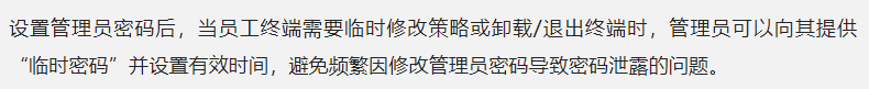 在“临时密码”有效期内再次点击【临时密码】按钮,显示【临时密码】弹窗,可点击“终止”按钮禁用,点击确定后提示“临时密码已失效”(终止后,终端将直接同步中心防护策略)。