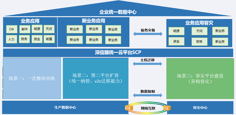 新上业务扩容资源池,将深信服虚拟化平台作为第二平台,通过纳管、迁移实现平台逐步切换