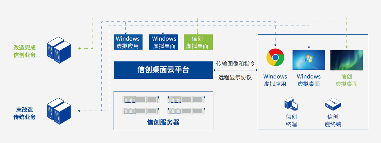 在双业务共存及演进阶段,由于部分Windows业务没有改造完成,为了保证办公业务不受影响,用户不得不同时使用windows桌面和信创桌面。深信服双模信创桌面云方案包含应用虚拟化和桌面虚拟化两大技术,可在桌面云集群中部署信创操作系统、Windows操作系统、Window虚拟应用;信创桌面承载已改造完成的信创业务,Windows桌面或Windows应用承载未改造完成的Windows业务,满足用户双业务办公场景的需求,保证业务连续性。